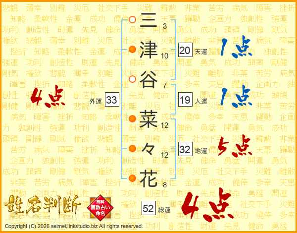 三(3画)津(10画)谷(7画) 菜(12画)々(12画)花(8画)