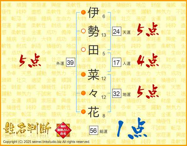 伊(6画)勢(13画)田(5画) 菜(12画)々(12画)花(8画)