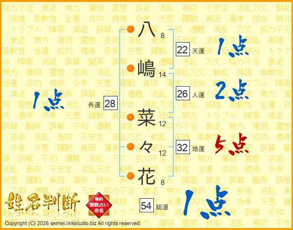 八(8画)嶋(14画) 菜(12画)々(12画)花(8画)