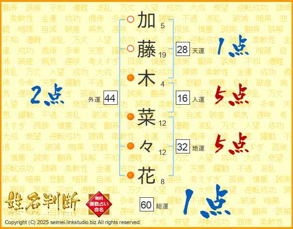 加(5画)藤(19画)木(4画) 菜(12画)々(12画)花(8画)