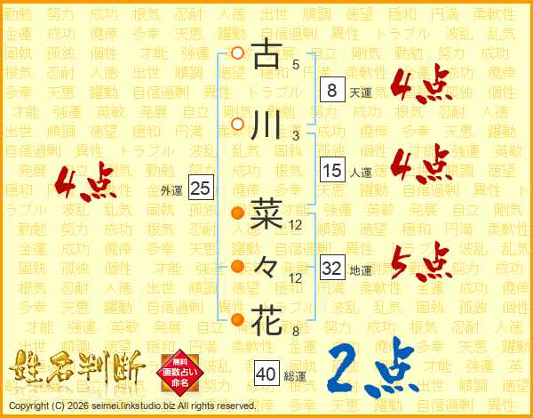 古(5画)川(3画) 菜(12画)々(12画)花(8画)