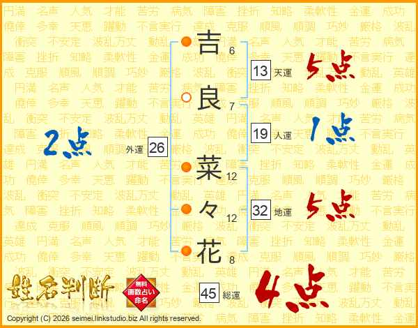 吉(6画)良(7画) 菜(12画)々(12画)花(8画)