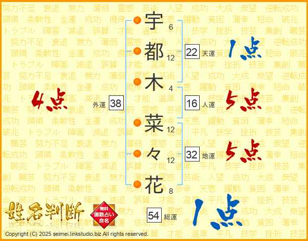 宇(6画)都(12画)木(4画) 菜(12画)々(12画)花(8画)
