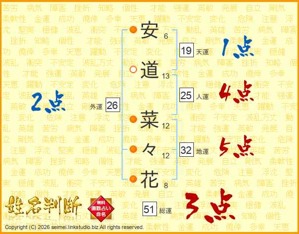 安(6画)道(13画) 菜(12画)々(12画)花(8画)