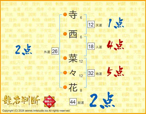 生活面を象徴する運勢です。外部から受ける影響力を表し、結婚運、家庭運や職場、環境への順応性を表します。総運から人運を引いた画数。姓や名が1文字の場合を除く。