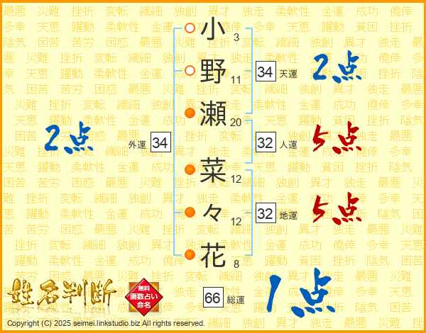 小(3画)野(11画)瀬(20画) 菜(12画)々(12画)花(8画)