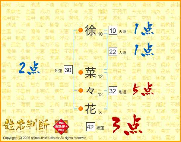 徐(10画) 菜(12画)々(12画)花(8画)