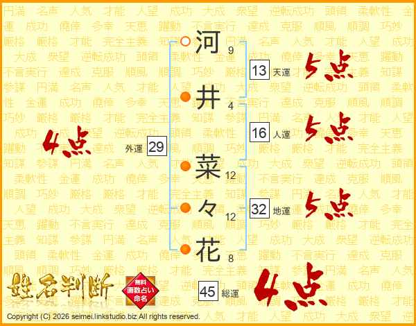 河(9画)井(4画) 菜(12画)々(12画)花(8画)