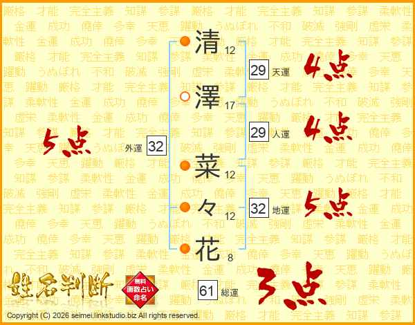 清(12画)澤(17画) 菜(12画)々(12画)花(8画)