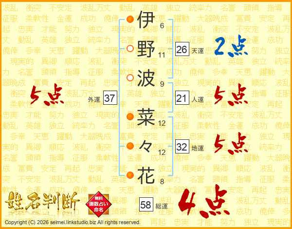 伊(6画)野(11画)波(9画) 菜(12画)々(12画)花(8画)