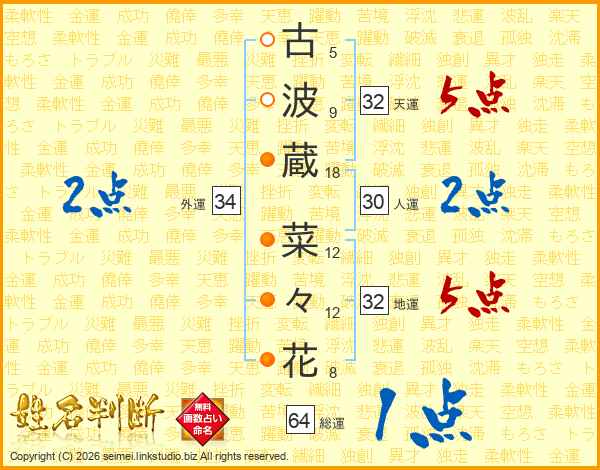 古(5画)波(9画)蔵(18画) 菜(12画)々(12画)花(8画)