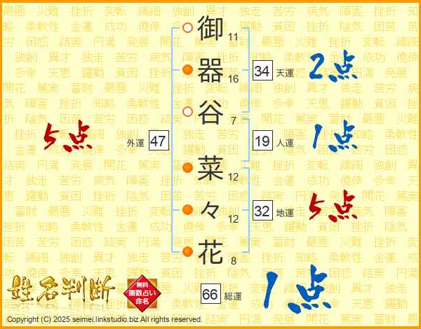 御(11画)器(16画)谷(7画) 菜(12画)々(12画)花(8画)