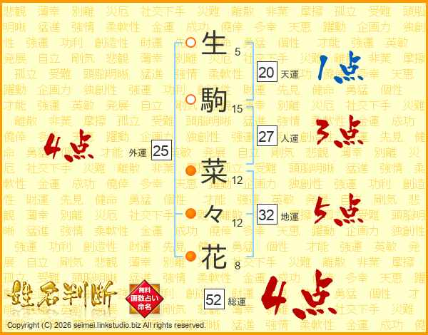 生(5画)駒(15画) 菜(12画)々(12画)花(8画)