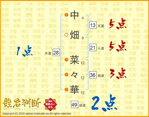 中(4画)畑(9画) 菜(12画)々(12画)華(12画)