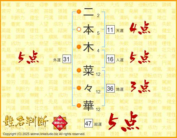 二(2画)本(5画)木(4画) 菜(12画)々(12画)華(12画)