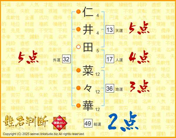 仁(4画)井(4画)田(5画) 菜(12画)々(12画)華(12画)