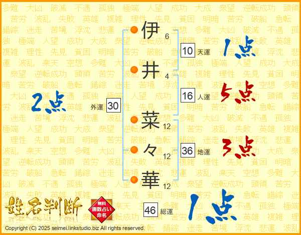 伊(6画)井(4画) 菜(12画)々(12画)華(12画)