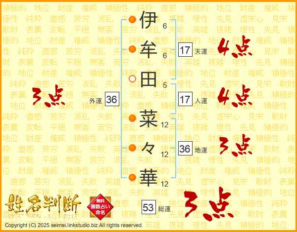 伊(6画)牟(6画)田(5画) 菜(12画)々(12画)華(12画)