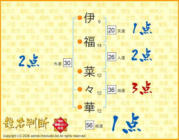 伊(6画)福(14画) 菜(12画)々(12画)華(12画)