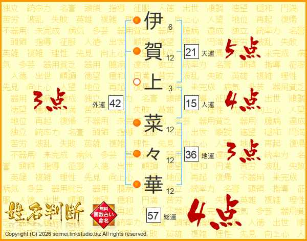 伊(6画)賀(12画)上(3画) 菜(12画)々(12画)華(12画)