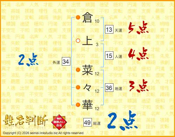 倉(10画)上(3画) 菜(12画)々(12画)華(12画)