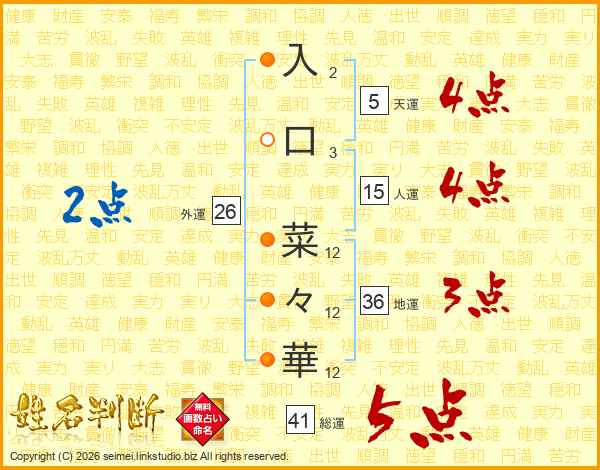入(2画)口(3画) 菜(12画)々(12画)華(12画)