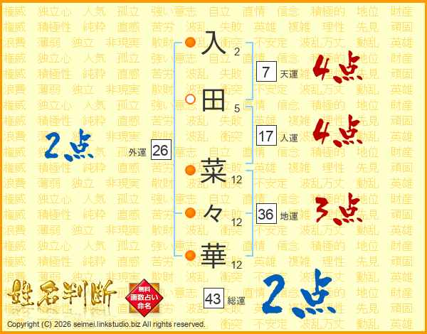 入田菜々華さんの総運は43画の2点!