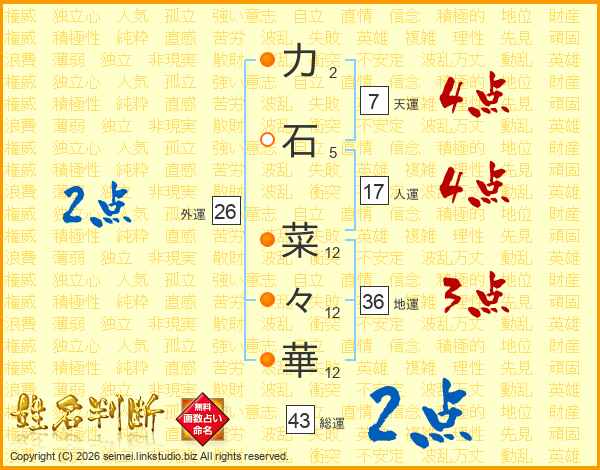 力(2画)石(5画) 菜(12画)々(12画)華(12画)