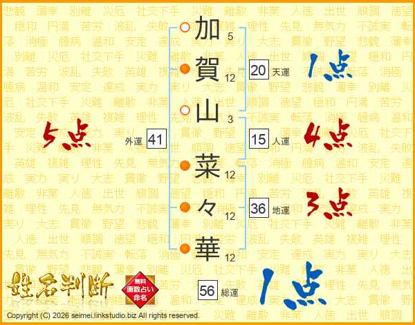 加(5画)賀(12画)山(3画) 菜(12画)々(12画)華(12画)