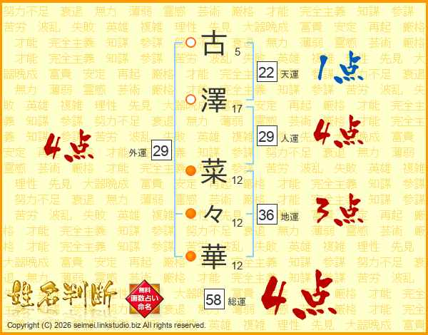 古(5画)澤(17画) 菜(12画)々(12画)華(12画)