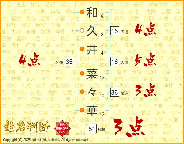 和(8画)久(3画)井(4画) 菜(12画)々(12画)華(12画)