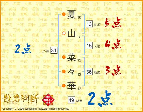 生活面を象徴する運勢です。外部から受ける影響力を表し、結婚運、家庭運や職場、環境への順応性を表します。総運から人運を引いた画数。姓や名が1文字の場合を除く。