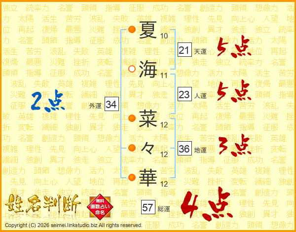 夏(10画)海(11画) 菜(12画)々(12画)華(12画)