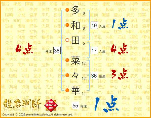 多(6画)和(8画)田(5画) 菜(12画)々(12画)華(12画)