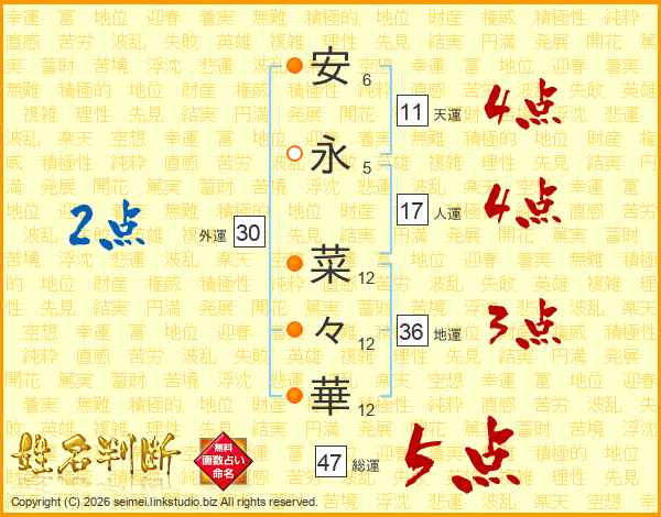 安(6画)永(5画) 菜(12画)々(12画)華(12画)