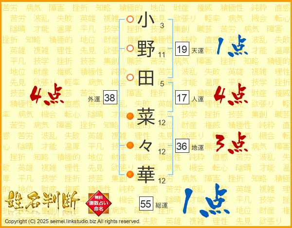 小(3画)野(11画)田(5画) 菜(12画)々(12画)華(12画)