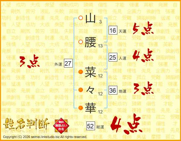 山(3画)腰(13画) 菜(12画)々(12画)華(12画)