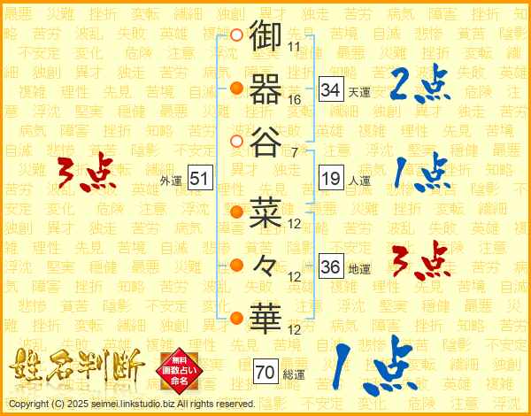 御(11画)器(16画)谷(7画) 菜(12画)々(12画)華(12画)