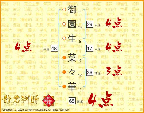 御(11画)園(13画)生(5画) 菜(12画)々(12画)華(12画)