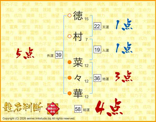 徳(15画)村(7画) 菜(12画)々(12画)華(12画)