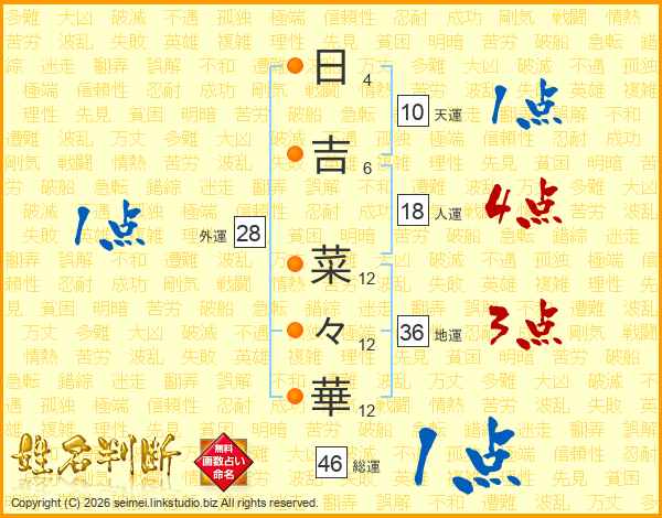 日(4画)吉(6画) 菜(12画)々(12画)華(12画)