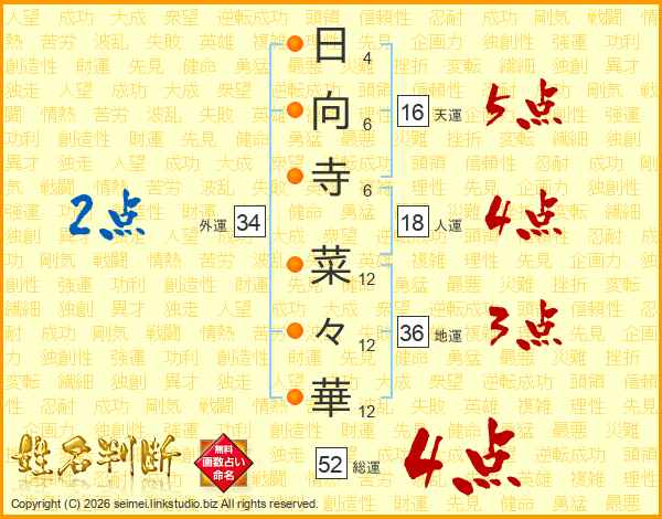 日(4画)向(6画)寺(6画) 菜(12画)々(12画)華(12画)