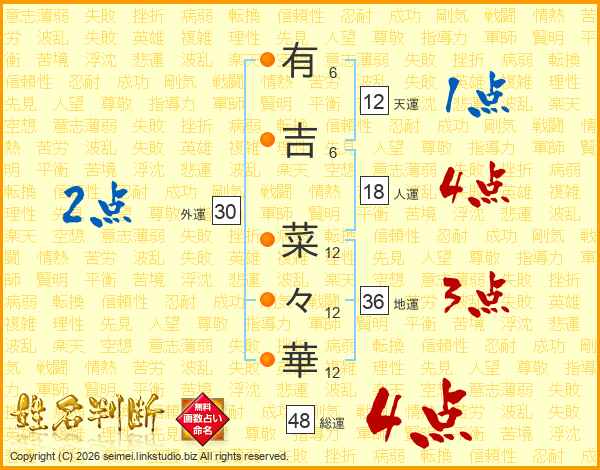 有(6画)吉(6画) 菜(12画)々(12画)華(12画)