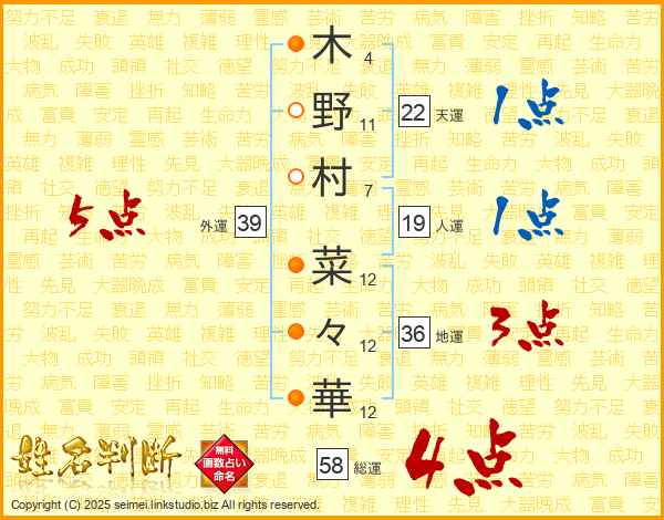 木(4画)野(11画)村(7画) 菜(12画)々(12画)華(12画)