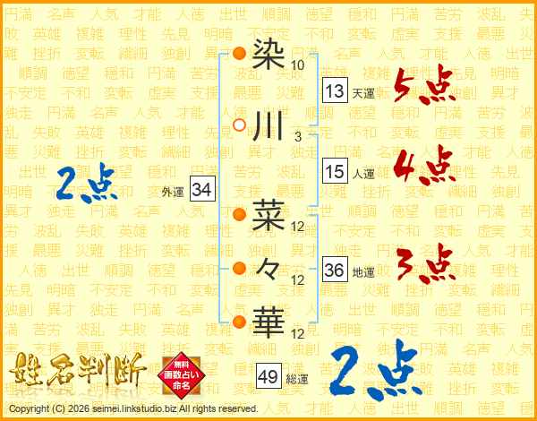 染(10画)川(3画) 菜(12画)々(12画)華(12画)