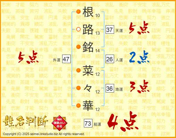 根(10画)路(13画)銘(14画) 菜(12画)々(12画)華(12画)