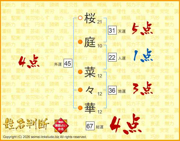 桜(21画)庭(10画) 菜(12画)々(12画)華(12画)