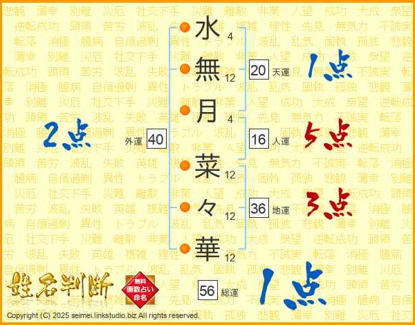 水(4画)無(12画)月(4画) 菜(12画)々(12画)華(12画)