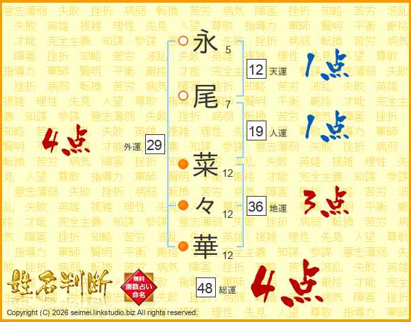 永(5画)尾(7画) 菜(12画)々(12画)華(12画)