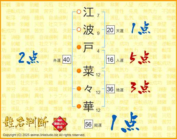江(7画)波(9画)戸(4画) 菜(12画)々(12画)華(12画)